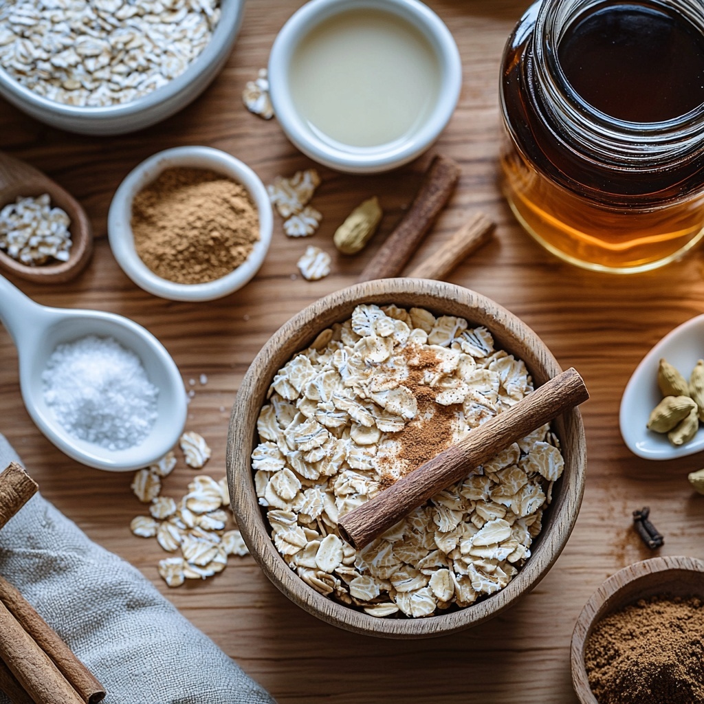 2. Mix Ingredients: In a large bowl, combine the rolled oats, spices (cinnamon, ginger, cloves, cardamom), baking powder, and salt. Add the almond milk, maple syrup, and vanilla extract, then stir well until all components are thoroughly incorporated.
