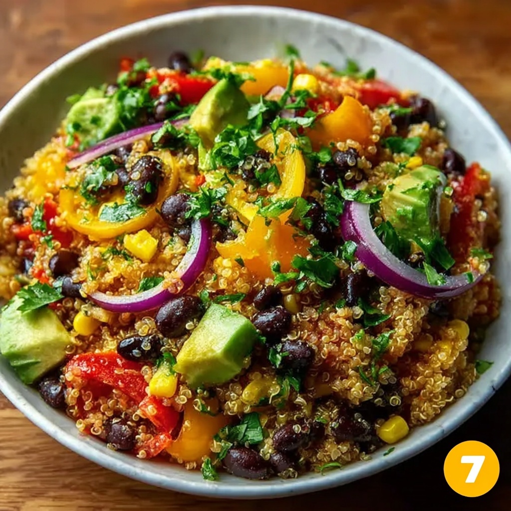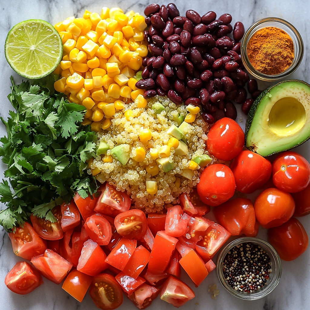 In a large mixing bowl, toss together the cooled quinoa, black beans, corn, diced red and yellow bell peppers, creamy avocado, finely chopped red onion, juicy cherry tomatoes, and fresh cilantro. This colorful combination is already a feast for the eyes and palate.
