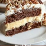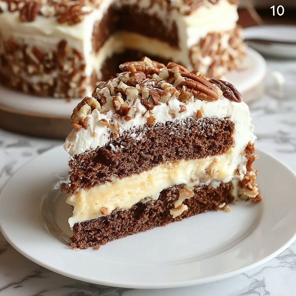8. Add Garnish and Chill: Sprinkle the optional shredded sweetened coconut and chopped pecans over the frosted cake for garnish. Chill the assembled cake in the refrigerator for at least 1 hour before serving to allow the flavors to meld and the frosting to set.